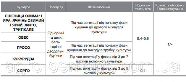· широкий діапазон застосування (до 6-7 кукурудзяного листа або до утворення другого міжвузля у зернових культур);